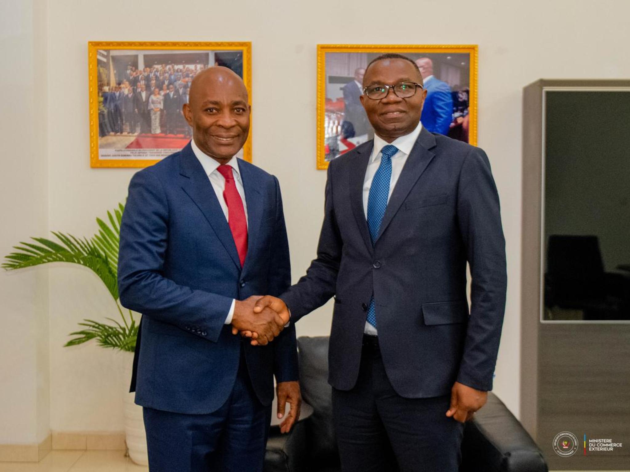 Le ministre du Commerce extérieur, Julien Paluku Kahongya, et le Gouverneur du Sud-Kivu, Jean-Jacques Purusi Sadiki, ont tenu une réunion technique, ce mardi 7 avril 2026, à Kinshasa, sur la facilitation du commerce transfrontalier entre le Sud-Kivu et les provinces voisines, notamment le Tanganyika et le Nord-Kivu, ainsi qu'avec les pays voisins, dont le Burundi et la Tanzanie. Cette réunion a également porté sur la reprise des travaux de construction et de modernisation des infrastructures, y compris les marchés transfrontaliers de Kavimvira, Nyamoma et Kagando, ainsi que le port de Kalundu, financés par la Banque Mondiale à travers le Projet de Facilitation du Commerce et d'Intégration dans la Région des Grands Lacs (PFCIGL).